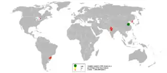 Graphite occurs in metamorphic rocks as a result of the reduction of sedimentary carbon compounds during metamorphism. It also occurs in igneous rocks and in meteorites.[5] Minerals associated with graphite include quartz, calcite, micas and tourmaline. The principal export sources of mined graphite are in order of tonnage: China, Mexico, Canada, Brazil, and Madagascar.[11]