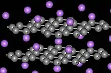 Graphite consists of sheets of trigonal planar carbon.[15][16] The individual layers are called graphene. In each layer, the carbon atoms are arranged in a honeycomb lattice with a bond length of 0.142 nm, and the distance between planes is 0.335 nm.[17] Bonding between layers is relatively weak van der Waals bonds and are often occupied by gases, which allows the graphene-like layers to be easily separated and to glide past each other.[18]