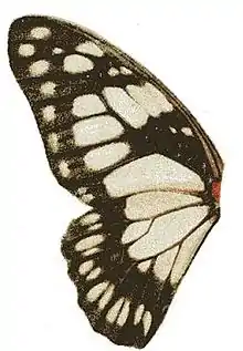 Differs from [related species]] in that the discal spots of cellules 1 a and 1 b of the forewing cover the base of these cellules; the submarginal spots of cellules 4—8 of the fore¬wing are single, rounded and rather large, those of the hindwing on the contrary represented in each cellule by two streaks; the basal spots of cellules 2, 3 and 6 of the hindwing are sharply defined distally, transversely cut off or rounded; the cell of the forewing before the middle with three white dots in a transverse line, then a large transverse spot divided into three parts by the dark folds and finally at the apex two white dots; the discal spots of cellules 2—4 of the forewing are usually rounded and more or less separated. — German and British East Africa. [4]