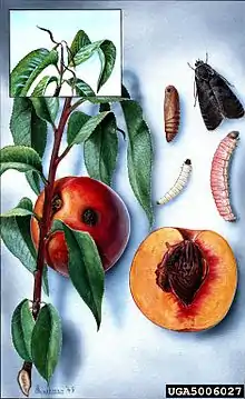 The larvae feed on peach, apple, quince, pear, plum, cherry, apricot and nectarine. They are pinkish to creamy-white with brown heads and about 13 mm long. Early in the season, larvae tunnel in tender twigs causing twig die-back. Heavy infestations may give the tree a bushy appearance. Later generations may feed on terminal growth and developing peaches. Larvae attacking the fruit often enter near or through the stem and bore directly into the interior of the fruit. Larger peaches may show no external damage. Fruit damage may cause an increase in the amount of brown rot.