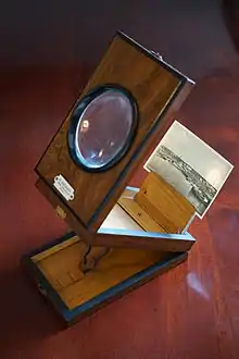 A graphoscope was a 19th-century device used in parlors in order to enhance the viewing of photographs and text. The graphoscope is supposed to be based on a 1864 patent of Charles John Rowsell.[1] These novelty items consisted of a single magnifying glass, often in a wooden frame, in an overall construction that could collapse into a compact rectangular form. A photo/card holder was usually also included. A KOMBI camera often had included its design a graphoscope for better film viewing. Many devices combined a Stereoscope and Graphoscope.