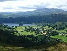 Grasmere is a village in Westmorland and Furness, Cumbria, England, in the centre of the Lake District and named after its adjacent lake. Grasmere lies within the historic county of Westmorland. The Ambleside and Grasmere ward had an estimated population of 4,592 in 2019.[2] William and Dorothy Wordsworth, the 'Lake Poets', lived in Grasmere for 14 years and called it "the loveliest spot that man hath ever found."[3]