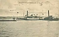 After the death of Denning, his property passed through the hands of Philip Verplanck, Isaac L. Pratt and Dr. Lawrence Proudfoot. In 1830 Proudfoot built the first steamboat landing at Grassy Point. Owing to the depth of water, it was the stopping place for steamers passing up and down the river. The first hotel at Grassy Point was kept by Dr. Proudfoot in a double house near the steamboat wharf. On the north side of that house was a small addition in which Proudfoot kept a small store and bar, and in which the first post office was opened.[2]