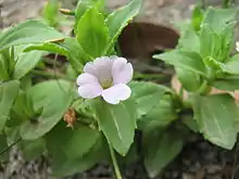 Gratiola peruviana, commonly known as austral brooklime, is a small perennial herb in the family Plantaginaceae.[1] The species is native to South America and Australasia. It grows to between 10 and 30 centimetres high and has pink or white tubular flowers with red-purple stripes inside.[2] These are followed by ovoid capsules that are up to 7mm long. The stem-clasping ovate leaves are arranged in opposite pairs and have shallowly toothed edges.[3]