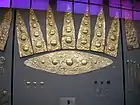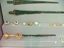 Many objects were designed to signify the social ranking of the deceased, for instance, decorated daggers, which were art objects and cannot be considered real weapons. Ornate staffs, as well as a scepter from Grave IV, clearly indicate a very significant status of the deceased.[25] Items such as bulls' heads with a double-axe display clear Minoan influences.[26] At the time that the Grave Circle was built, the Mycenaeans had not yet conquered Minoan Crete. Although it seems that they recognized the Minoans as the providers of the finest design and craftsmanship,[27] most of the objects buried in Grave Circle A were decorated in the Minoan style. On the other hand, specific motifs such as fighting and hunting scenes are clearly of Mycenaean style.[28] The combination of luxury goods found at this site represented many different societies of the time. This was an example of an "international style," which means countries would use the basic technology of one society and modify it to fit the standard imagery of their society.[29]