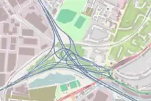 The Gravelly Hill Interchange, also known as Spaghetti Junction, provides the intersection between the A38(M) Aston Expressway from the centre of Birmingham to the M6 motorway. The complex junction also supports local roads joining the two motorways. The design of the intersection was also made complex by the presence of two railway lines including a high speed electrified railway and the existence of three canals including a turning basin, and two rivers.
