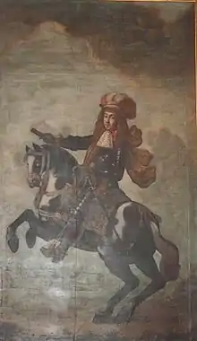 Over the centuries many works of art were collected in the mansion. The ceremonial hall was painted in the mid-nineteenth century by Giuseppe Lorenzo Gatteri, a fresco painter from Trieste.[1] The fresco on the ceiling depicts Apollo on a chariot.[7] Before World War II there was an important collection of work by the Venetian masters. The hall is reached by a richly stuccoed staircase from the left of the atrium. Three statues on the balustrade of the stairway represented sculpture, painting and architecture. One of these has been lost. Until 1967 there were four large equestrian portraits on the walls of this stairway: the Polish King John III Sobieski, Charles V, Duke of Lorraine the Austrian Emperor Leopold I and Prince Eugene of Savoy. The staircase today is hung with pictures of prominent members of the Gravisi family.[1]