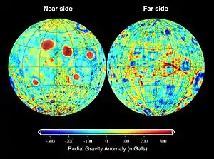 A major feature of the Moon's gravitational field is the presence of mascons, which are large positive gravity anomalies associated with some of the giant impact basins. These anomalies significantly influence the orbit of spacecraft around the Moon, and an accurate gravitational model is necessary in the planning of both crewed and uncrewed missions. They were initially discovered by the analysis of Lunar Orbiter tracking data:[16] navigation tests prior to the Apollo program showed positioning errors much larger than mission specifications.