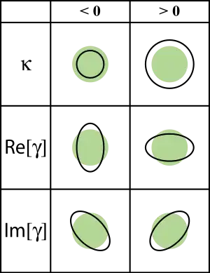 Like the traditional ellipticity, the magnitudes of both of these quantities range from 0 (circular) to 1 (a line segment). The position angle is encoded in the complex phase, but because of the factor of 2 in the trigonometric arguments, ellipticity is invariant under a rotation of 180 degrees. This is to be expected; an ellipse is unchanged by a 180° rotation. Taken as imaginary and real parts, the real part of the complex ellipticity describes the elongation along the coordinate axes, while the imaginary part describes the elongation at 45° from the axes.