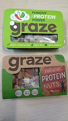 Graze (stylised as graze) is a United Kingdom-based snack company which is owned by Unilever.[2] Graze offers over 200 snack combinations[3] through snack subscription boxes, an online shop[4] and retailers. The company distributes thousands of snack boxes per day across the UK.[5] Graze expanded operations to include the United States in 2013,[6] launching snacks into US retailers in 2016.[7]