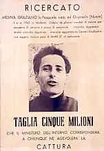 Mesina escaped from prison in 1966 with Miguel Atienza by climbing over a 7.3 m (24 ft) wall and began a kidnapping spree.[4][6] Mesina was arrested on 26 March 1968.[5] That same year, The New York Times described him as "Italy's most-wanted bandit".[7] After he was arrested a crowd of schoolgirls gathered at the police station with cards saying "I love you" on them.[4] The Tough and the Mighty (1969) is based on his life.[8] In 1970, he watched Cagliari Calcio play football while dressed as a woman.[4] In August 1976, Mesina broke out of Lecce prison with a group of Italian mafia. On 16 March 1977, Mesina was re-captured.[4][9] He again escaped on 12 April 1985, when he obtained a 12-hour permit to visit his brother in Crescentino. He took refuge in the apartment of Valeria Fusè in Vigevano, but on 18 April, the carabinieri arrested both of them. Transferred to the maximum security prison of Novara, Mesina was sentenced to a further six months in prison, while Fusè was acquitted.[10] On 18 October 1992, Mesina was granted parole and settled in Asti.[11] That year, Mesina helped secure the release of Farouk Kassam, who had been kidnapped. On 4 August 1993, his parole was revoked after police found weapons with Mesina.[3][6] He was sentenced to life imprisonment.[12]