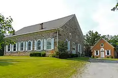Built in 1787, it is a six-bay-wide and three-bay-deep rectangular fieldstone building, which features rounded arched doors and windows and a rounded arch ceiling.
