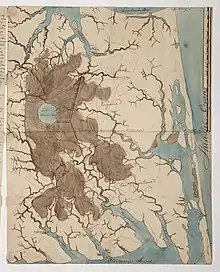 The Great Dismal Swamp is in southeastern Virginia and northeastern North Carolina between the James River (Norfolk, Virginia) and the Albemarle Sound (Edenton, North Carolina).[1] The original swamp was estimated to be over 1,000,000 acres (400,000 ha);[1] however, human encroachment has destroyed up to 90% of the original swampland.[2][3][4]
