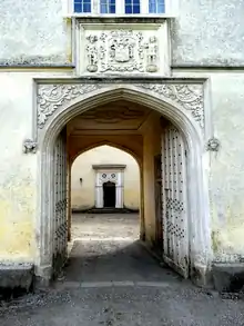 William Fulford (1476–1517), younger brother, married Jane Bonville, one of the six daughters[48] and co-heiresses of John Bonville (died 1491) of Combe Raleigh, illegitimate son[49][50] of the Devon magnate William Bonville, 1st Baron Bonville (1391–1461), of Shute, by his mistress, Elizabeth Kirkby. John's wife was Alice Dennis, daughter and sole heiress of William Dennis,[51] by his wife Joan St Aubyn, heiress of Combe Raleigh. Joan was one of two daughters and co-heiresses of Sir John St Aubyn of Combe Raleigh and his wife Catherine Chalons, daughter and heiress of Sir Robert Chalons (died 1445).[52] The arms of Dennis of Glamorgan (not to be confused with the Denys families of Holcombe Burnell and Orleigh in Devon), St Aubyn and Chalons form the last three quarters (7th, 8th & 9th) on the 16th century stone escutcheon over the entrance archway into the courtyard of Great Fulford House.