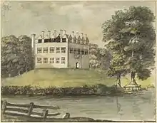 John Fulford (1736–1780) (4th and eldest surviving son), known as "Squire John"[76] and "Red Ruin". He married Elizabeth Laroche (1731–1791), daughter of John Laroche. The marriage was without children.[77] In the 1760s he spent lavishly on furnishing and landscaping Great Fulford, which included the creation of the lake and carriage drives through the park. He was one of the last in England to employ a full-time fool "dressed in the motley".[76] In this unusual respect he resembled his contemporary Devonian John Arscott (1719–1788) of Tetcott, who kept as a member of his household a dwarf jester named Black John,[78] whose eccentric ways were described in Footprints of Former Men in Cornwall (1870) by Robert Stephen Hawker, and also in Devonshire Characters and Strange Events (1908) by Sabine Baring-Gould. His portrait showing him dressed as a cavalier in a crimson costume survives at Great Fulford. He overspent and was forced to sell several of his unentailed estates, and moved with his wife to Italy to live more cheaply.[76]