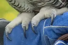 The legs, feet, and talons are large and powerful. Tarsal length is 54–80 mm (2.1–3.1 in).[12] The average foot span of a fully spread foot, from talon to talon, is around 20 cm (7.9 in), as compared to 8 cm (3.1 in) in long-eared owls, 13 to 15 cm (5.1 to 5.9 in) in barn owls, and 18 cm (7.1 in) in the great grey owl.[6][29] Great horned owls can apply at least 300 lb/in2 of crushing power in their talons, a pressure considerably greater than the human hand is capable of exerting. In some big females, the gripping power of the great horned owl may be comparable to much larger raptor species such as the golden eagle.[30]