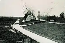 A group of influential bankers in New Orleans met to discuss how to guarantee the safety of the city, as they had already learned of the massive scale of flooding upriver.[11] On 29 April they arranged to set off about 30 tons of dynamite on the levee at Caernarvon, Louisiana, releasing 250,000 cu ft/s (7,000 m3/s) of water. This was intended to prevent New Orleans from suffering serious damage, and it resulted in flooding much of the less densely populated St. Bernard Parish and all of Plaquemines Parish's east bank. As it turned out, the destruction of the Caernarvon levee was unnecessary; several major levee breaks well upstream of New Orleans, including one the day after the demolitions, released major amounts of flood waters, reducing the water that reached the city. The New Orleans businessmen did not compensate the losses of people in the downriver parishes.[12]