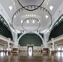 In the central courtyard are six large hydraulically operated umbrellas, inspired by the ones at Al-Masjid al-Nabawi in Medina, which are used to protect worshipers;[2] the six umbrellas represent the six tenets of iman.[3] More than 15,000 worshipers can fit in the 7,669-square-metre (82,550 sq ft) prayer area.[2][4] At the open end of the U is a series of Arabic-style arches, with Arabic calligraphs of 99 attributes of Allah, stood on 25 pillars, each representing one of the named prophets in Islam.[3] Beyond the arches is an inscription on a 3.2-metre (10 ft) tall, 7.8 ton stone from Mount Merapi, designed by Nyoman M. Alim.[1][3]