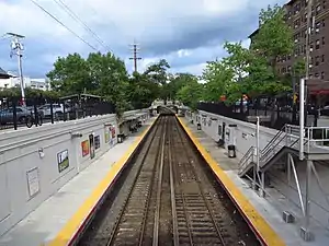 Track 2 extends approximately one-train length beyond the station before merging with Track 1. As part of the LIRR's East Side Access extension project to Grand Central Terminal, the MTA is extending Track 2 an additional 1,200 feet (370 m) east, making it long enough to store two trainsets.[6][7][8][9] This will allow the LIRR to increase the number of peak-hour trips between Great Neck and Penn Station/Grand Central. It also included replacement of the original Colonial Road Bridge, built in 1897, which passes over the area of the expanded pocket track, with a new bridge with wider lanes and built to reduce noise. Also included in the project are drainage improvements to the right of way to alleviate flooding on the tracks during storms. In 2010, several homeowners in the area opposed the project, arguing that construction would harm their quality of life. Representatives from the MTA stated that the expanded pocket track would not be used for overnight train storage or maintenance.[6] The project was initially scheduled for completion in December 2015.[10] Because of delays, the new bridge was installed in April 2016, and the construction of the pocket track was scheduled for completion in December 2018 at a total cost of $45.2 million.[11] However, the completion date was again pushed back several times;[12]: 60 as of November 2021, a tentative completion date of August 2022 was annnounced,[13]: 59 though construction is still underway as of November 2022 and is now expected to be complete by the end of the month.[14][15]