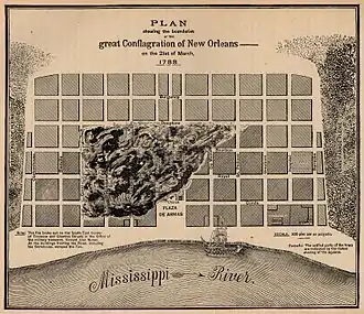 The Good Friday fire began about 1:30 p.m. at the home of Army Treasurer Don Vincente Jose Nuñez, 619 Chartres Street, corner of Wilkinson,[1] less than a block from Jackson Square (Plaza de Armas). Because the fire started on Good Friday, priests refused to allow church bells to be rung as a fire alarm.[2] Within five hours it had consumed almost the entire city as it was fed by a strong wind from the southeast. The fire destroyed virtually all major buildings in the city (now French Quarter), including the church, municipal building, army barracks, armory, and jail. Colonial Governor Esteban Rodríguez Miró set up tents for the homeless.[1]
