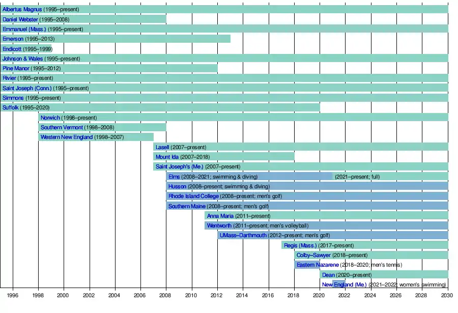 - 2022 - New England (Me.) left the GNAC as an associate member for women's swimming & diving, effective after the 2021-22 academic year.[2]