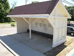 Prior to the establishment of passenger service, the site of Great River station was occupied by a freight-only station built by the South Side Railroad of Long Island (SSRRLI) known as Youngsport station.[2] The station opened in 1897, and the original station building burned down in 1943. Between that time, a sheltered-platform was added to the other side of the tracks. In 1945, a modernist station designed by architect Antonin Raymond replaced it,[3] but it was burned down in 2000. The third station with high-level platforms was built in the late 1990s. The original shelter, however was restored by the East Islip Historical Society, and remains within one of the parking lots along the eastbound platform.