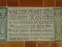 - In 1898 Walter Peart and Henry Dean were the driver and fireman of the Great Western train known as the Windsor Express. On 18 July 1898, they were driving the 4:15 train from Windsor to Paddington when, just outside Acton, the connecting rod broke. Part of it was driven through the boiler casing and caused damage to the firebox which overwhelmed the men with cinders, steam and fire. They succeeded in applying the brake and bringing the train to a safe standstill before leaving the engine at Acton station.[19]