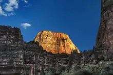 The Great White Throne[2] is a monolith, predominantly composed of white Navajo Sandstone in Zion National Park in Washington County in southwestern Utah, United States.[1] The north-west "main" face rises 2,350 feet (720 m) in 1,500 feet (460 m) from the floor of Zion Canyon near Angels Landing. It is often used as a symbol of Zion National Park. The Great White Throne can be seen from most locations along the scenic drive running through Zion Canyon.