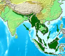 It is found in the Indian subcontinent and Southeast Asia, ranging across Bangladesh, Bhutan, Brunei, Cambodia, India, Indonesia, Laos, Malaysia, Myanmar, Nepal, the Philippines, Singapore, Thailand and Vietnam. It is found in the Greater Sundas, but it does not inhabit Bali.[1][2]
