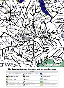 The Chimgan village was settled 400–500 years ago in the mountain massive of dominant the Greater Chimgan peak (3,309 m), at an altitude of 1,620 m.