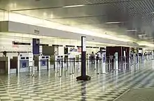 This terminal has two angled concourses, each with 11 gates. Gate assignments are listed below. The eastern or B concourse opened in summer 1990. The eastern half of the main terminal opened in 1991. The western half of the main terminal, western or A concourse, and garage, all opened in 1992. A series of temporary prefabricated buildings were used to provide gate space and baggage claim space during the construction.