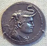 During the two centuries of their rule, the Indo-Greek kings combined the Greek and Indian languages and symbols, as seen on their coins, and blended Greek and Indian ideas, as seen in the archaeological remains.[17] The diffusion of Indo-Greek culture had consequences which are still felt today, particularly through the influence of Greco-Buddhist art.[18] The ethnicity of the Indo-Greek may also have been hybrid to some degree. Euthydemus I was, according to Polybius,[19] a Magnesian Greek. His son, Demetrius I, founder of the Indo-Greek kingdom, was therefore of Greek ethnicity at least by his father. A marriage treaty was arranged for the same Demetrius with a daughter of the Seleucid ruler Antiochus III. The ethnicity of later Indo-Greek rulers is sometimes less clear.[20] For example, Artemidoros (80 BC) was supposed to have been of Indo-Scythian descent, although he is now seen as a regular Indo-Greek king.[21]