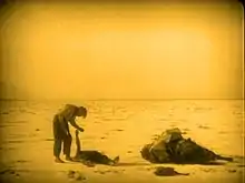 After filming in San Francisco wrapped in late June, the production traveled to Death Valley. Most Hollywood films that required desert scenes settled for the local Oxnard dunes north of Los Angeles, but von Stroheim insisted on authenticity.[25] Death Valley had no roads, hotels, gas stations or running water and was occupied by tarantulas, scorpions and venomous snakes. The nearest populated area to the shoot was 100 miles (160 km) away and insurance coverage was denied.[44] Filming in Death Valley lasted for two months during midsummer, allowing actors Gowland and Hersholt time to grow the beards necessary for the sequence.[45] Some members of the production reported temperatures between 91 and 161 °F (33 and 72 °C), but the highest temperature officially recorded in Death Valley during the period was 123 °F (51 °C).[46] Of the 43 members of the cast and crew who worked on the Death Valley sequence, 14 became ill and were sent back to Los Angeles.[47]