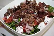 Greek salad or horiatiki salad (Greek: χωριάτικη σαλάτα[lower-alpha 1] or θερινή σαλάτα[lower-alpha 2]) is a popular salad in Greek cuisine generally made with pieces of tomatoes, cucumbers, onion, feta cheese (usually served as a slice on top of the other ingredients), and olives (typically Kalamata olives) and dressed with salt, Greek oregano, and olive oil. Common additions include green bell pepper slices or caper berries (especially on the Dodecanese islands). Greek salad is often imagined as a farmer's breakfast or lunch, as its ingredients resemble those that a Greek farmer might have on hand.[1]