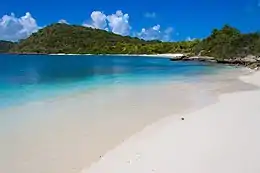 The island itself measures about two kilometers from west to east; its width varies by two south-facing peninsulas in the range of a few hundred meters (maximum 650 m),[2] forming several sheltered bays. Altogether, the island has an area of about 40ha.[3] A sea-side peninsula ends in the Man of War Point, as the eastern tip of Antigua (as a region, east point of the main island the Neck of Land), from which the Atlantic Ocean[4] extends over nearly 4,000 kilometers to the approximately latitude Cape Verde. The island rises only a few meters above sea level, and is composed of tropical brushwood and partly lined by rock, partly by pure white beaches. On both sides are reefs and rocks in front, the northern reef blocks the entire Nonsuch Bay and extends to Long Bay.