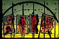 The work features 13 lightning bolts ranging in height from 13 to 30 feet (4.0 to 9.1 m) shooting into the ground over a 180-by-160-foot (55 by 49 m) area. On a main sign-like structure were four boxes measuring 8 by 10 by 2 feet (2.44 m × 3.05 m × 0.61 m) with images silk-screened on the back dealing with contemporary social issues. In front of these images and protected by clear LEXAN panels were neon tubes of a graffiti image that Lawless found on the side of a condemned building. These figures were a pun on Planters' Mr. Peanut character, appearing to be dancing penises dressed up with a top hat and a cane. In the fourth box, a sixty-second sequence featured the character removing his top hat and taking a bow to the crowd. Behind and above the main steel structure that held these boxes were four rows of brightly painted tin stars that spun in the wind, a metaphor for the cosmos.