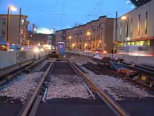 Although the planned road widening never occurred, the MBTA ultimately reconstructed the line for use by the new LRVs as part of other road and sewer work on Huntington Avenue.[103] The MBTA work largely followed the plans proposed in the 1960s; the Northeastern footbridge was not included. The three previously proposed stops were cut along with Parker Street; the remaining stops at Brigham Circle, Longwood Medical Area, Museum-Ruggles, and Northeastern were rebuilt with wider and longer platforms. On March 21, 1980, service was cut back to a Symphony–Park Street shuttle (run by LRVs) to allow for construction, with route 39 buses again operating.[104][49] The shuttle was extended to Northeastern on June 21 and Brigham Circle on September 20.[49] Symphony was closed on January 3, 1981, during a budget crisis.[105][49] Service restoration on the outer section of the line, originally scheduled for 1981, was delayed by the budget issues.[104][106] Arborway service ultimately resumed on June 26, 1982, including peak-hour Heath Street short turns and the reopening of Symphony.[49][107][108]