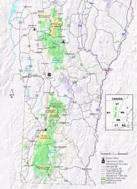 In descending order of land area, GMNF is located in parts of Bennington, Addison, Rutland, Windham, Windsor, and Washington counties.[1] The forest headquarters are in Rutland, Vermont, alongside those of Finger Lakes National Forest though that forest is in New York state.[4]