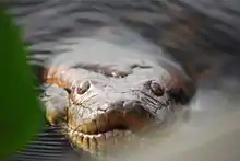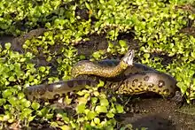 Primarily aquatic, they are apex predators, preying on a wide variety of prey, almost anything they can manage to overpower, including fish, amphibians, birds, a variety of mammals, and other reptiles.[30][31] Particularly large anacondas may consume large prey such as tapirs, deer, peccaries, capybaras, jaguars, and caimans, but such large meals are not regularly consumed.[32][18] Juvenile anacondas feed on prey such as small birds and juvenile caiman that are typically 40–70 grams in size. As they develop, their diet becomes increasingly complex. Prey availability varies more in grasslands than in river basins. Green anacondas in both habitats have been found to feed on large prey, usually ranging from 14% to 50% of its own mass. A few examples of their prey include broad-snouted caimans, spectacled caimans, yacare caimans, black caimans, smooth-fronted caimans, wattled jacanas, capybaras, red-rumped agoutis, collared peccaries, South American tapirs, boa constrictors, brown-banded water snakes, green iguanas, cryptic golden tegus, scorpion mud turtles, gibba turtles, Arrau turtles, savanna side-necked turtles, red side-necked turtles, and northern pudús.[33] Green anacondas take a high risk by feeding on larger prey, which occasionally lead to serious injuries or even death. Some also feed on carrion and conspecifics, usually inside or around water. Large anacondas can go weeks to months without food after eating a large meal, because of their low metabolism. However, females show increased postpartum feeding rates to recover from their reproductive investment.[31] The green anaconda's eyes and nose are located on the top of the head, allowing the snake to breathe and watch for prey while the vast majority of the body is hidden underwater.[34] Many local stories and legends report the anaconda as a man-eater, but little evidence supports any such activity. They employ constriction to subdue their prey. Cannibalism among green anacondas is also known, most recorded cases involving a larger female consuming a smaller male. While the exact reason for this is not understood, scientists cite several possibilities, including the dramatic sexual dimorphism in the species, and the possibility that a female anaconda requires additional food intake after breeding to sustain the long period of gestation. The nearby male simply provides the opportunistic female a ready source of nutrition.[35]