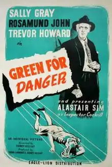 Green for Danger is a 1946 British thriller film, based on the 1944 detective novel of the same name by Christianna Brand. It was directed by Sidney Gilliat and stars Alastair Sim, Trevor Howard, Sally Gray and Rosamund John. The film was shot at Pinewood Studios in England. The title is a reference to the colour-coding used on the gas canisters used by anaesthetists.