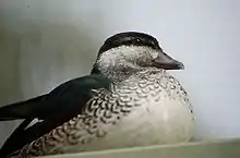 Ranging from 30 to 36 cm (12 to 14 in) in length, the green pygmy goose is one of the smallest species of duck. It has a 48 to 60 cm (19 to 23.5 in) wingspan. It has a small bill and a compact form. The breeding male has a predominantly dark green back and neck, and a dark gray crown. The cheeks are white, and the underparts are pale grey and white scalloped. The tail, primary flight feathers and primary coverts are black, while the secondary flight feathers are white. The secondary coverts are a dark iridescent green. This iridescence is lost outside of the breeding season and the plumage becomes duller. The species exhibits a degree of sexual dimorphism — the female has a barred rather than green neck but otherwise resembles the non-breeding male. Immature birds are less brightly coloured, and have mottled dark brown heads.[4]
