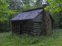 The Baxter/Jenkins Cabin, located near the junction of the Old Settlers Trail and the Maddron Bald Trail, was built by Willis Baxter and his son, William, in 1889. The cabin was originally a wedding gift to William, but was passed on to Willis' second son, Alex, when William's wife inherited property in Cosby. Chandler Jenkins was a later owner. The farm originally included two cabins, a barn, corn crib, smokehouse, hogpen, chicken house, and blacksmith shop, but this cabin and the chickenhouse are all that remain. In the 1950s, the chickenhouse was moved to the Mountain Farm Museum at Oconaluftee.[38]