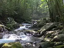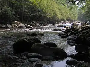 The upper watershed of the Middle Fork of the Little Pigeon River consists of a series of streams, some flowing down from Grapeyard Ridge to the west and a dozen or so flowing down from Greenbrier Pinnacle to the east. Each of these streams has cut a deep hollow, isolating the bottomlands of each amidst low ridges. Thus, rather than being one large community, Greenbrier consisted of several individual communities located along these streams. Most communities took the name of the stream upon which they were situated.[10] Along with Greenbrier Cove itself, the most prominent of these small communities included Copeland, Soak Ash, Webb Creek, Ramsey Creek, Noisy Creek, Redwine Creek, and Little Bird Branch, all at the base of Greenbrier Pinnacle, and Laurel Creek (now Rhododendron Creek), located on Grapeyard Ridge.
