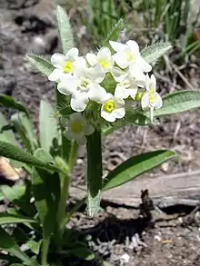 This is an annual herb producing a short, bristly, multi-branched stem tangled into a mat no more than 10 centimeters tall. It grows from a red taproot which dries purple. The leaves are up to 1.5 centimeters long, linear to widely lance-shaped, and densely hairy to bristly. The inflorescence is a length of developing fruits with a dense cluster of up to 5 flowers at the tip. The flower has a five-lobed white corolla with yellow appendages at the top of its tube. It flowers between April and August.[3]