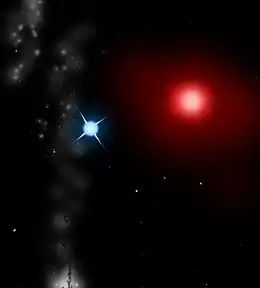 In astronomy, a green star is a white or blueish star that appears greenish in some viewing conditions (see § Psychology below). Under typical viewing conditions, there are no greenish stars, because the color of a star is more or less given by a black-body spectrum.[1] However, there are a few stars that appear greenish to some observers, due to the viewing conditions, for example the optical 'illusion' that a red object can make nearby objects look greenish (and vice versa). Some multiple star systems, such as Antares, have a bright reddish or yellowish star where this contrast makes other stars in the system seem greenish.