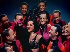 Carmen Miranda, on the other hand, who here sings "Give Me a Band and a Bandana," was still at the peak of her popularity, with Greenwich Village coming hot on the heels of her best and most famous film, The Gang's All Here (1943). Film historian Jeanine Basinger has written astutely that the Brazilian bombshell "wasn't a real movie star, but someone who did star turns in movies...She was an important escape fantasy of World War II."[6] Known for her insanely over-the-top costumes, elaborate, fruit-laden headpieces, and hugely energetic singing and dancing, Carmen Miranda was always exaggerated to a delightful level.[7]