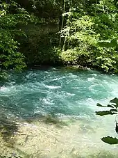 The spring emerges at the bottom of a narrow chasm. An upper outlet flowing from a cavern is only a fraction of Greer Spring's large flow. About 100 feet (30 m) downstream (north) the main outlet boils to the surface in a mixture of deep, aqua-blue water, moss covered rocks, and frothy whitewater. The newly formed surface stream then races down a small, steep, hardwood blanketed gorge dropping 65 feet (20 m) in elevation for 1.2 miles (1.9 km) to its confluence with the Eleven Point River. Greer Spring greatly increases the flow of the river, ensuring ample water for recreational activities, such as boating, even in the dry months. The vast amount of spring water changes the Eleven Point River into a coldwater stream for several miles downstream. The spring's cold water also creates ideal conditions for trout. The mouth of the spring branch is roughly 0.5 miles upstream (west) of the Missouri Route 19 bridge over the Eleven Point River. Greer Spring may be the most secluded and undisturbed big spring in the Ozarks. The spring has been owned by the U.S. National Forest Service since 1993.[3] Before 1993 the spring was in the caring hands of private ownership. The area surrounding the spring has been retaken by nature, but had a small fish hatchery and roads many years ago, the site has remained very scenic and unspoiled.