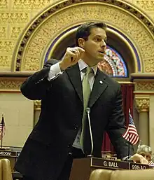Ball has stated that "since my election victory, we have made extraordinary progress by elevating the debate on tough issues like taxes, illegal immigration and dysfunction in Albany."[31][32] He was sworn into office on January 8, 2007.[33][34] The first time Ball rose to speak in the Assembly chamber, he called the legislature "dysfunctional", and withstood boos from his colleagues.[35][36][37] The next day, Governor Spitzer called Ball to express support for his sentiments.[38][39]