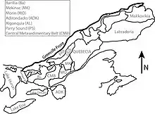 The Grenville Province is a tectonically complex region, in Eastern Canada, that contains many different aged accreted terranes from various origins. It exists southeast of the Grenville Front[1] and extends from Labrador southwestern to Lake Huron. It is bounded by the St. Lawrence River/Seaway to the southeast.[2]