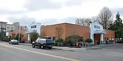 The building occupied by the library was constructed in 1989 and opened in January 1990.[2] It replaced a 1913 Tudor style building at 410 N. Main Street, which had been a Carnegie library.[3] The new building was paid for by a $2.1 million fund-raising campaign designed in part by then-Governor Neil Goldschmidt, including $1.7 million serial levy approved by Multnomah County voters in 1987 and a projected $200,000 from the sale of the original building.[2][4] Following the levy, three attempts to buy suitable property that could be developed within the $1.7 million approved had failed by mid-1988, leading to the consideration of several more expensive options.[5]